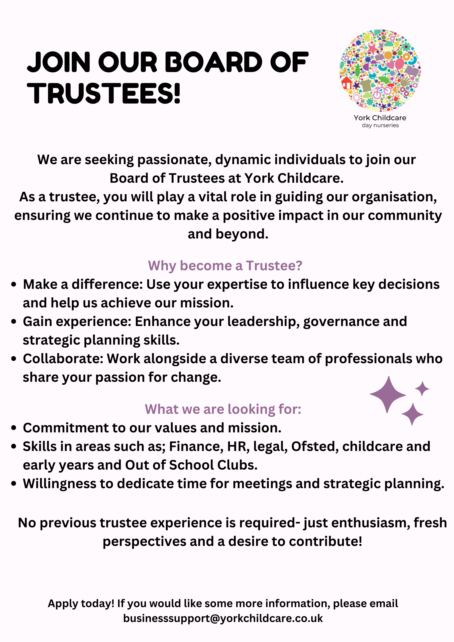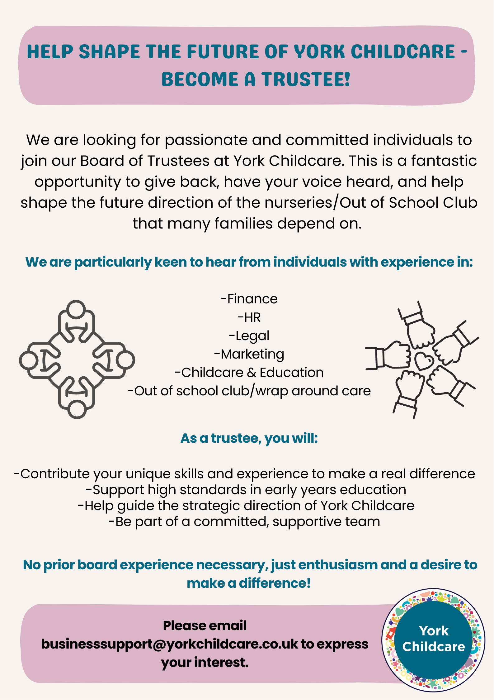If you are interested in being considered as a trustee of York Childcare, please click the link below for more information;
